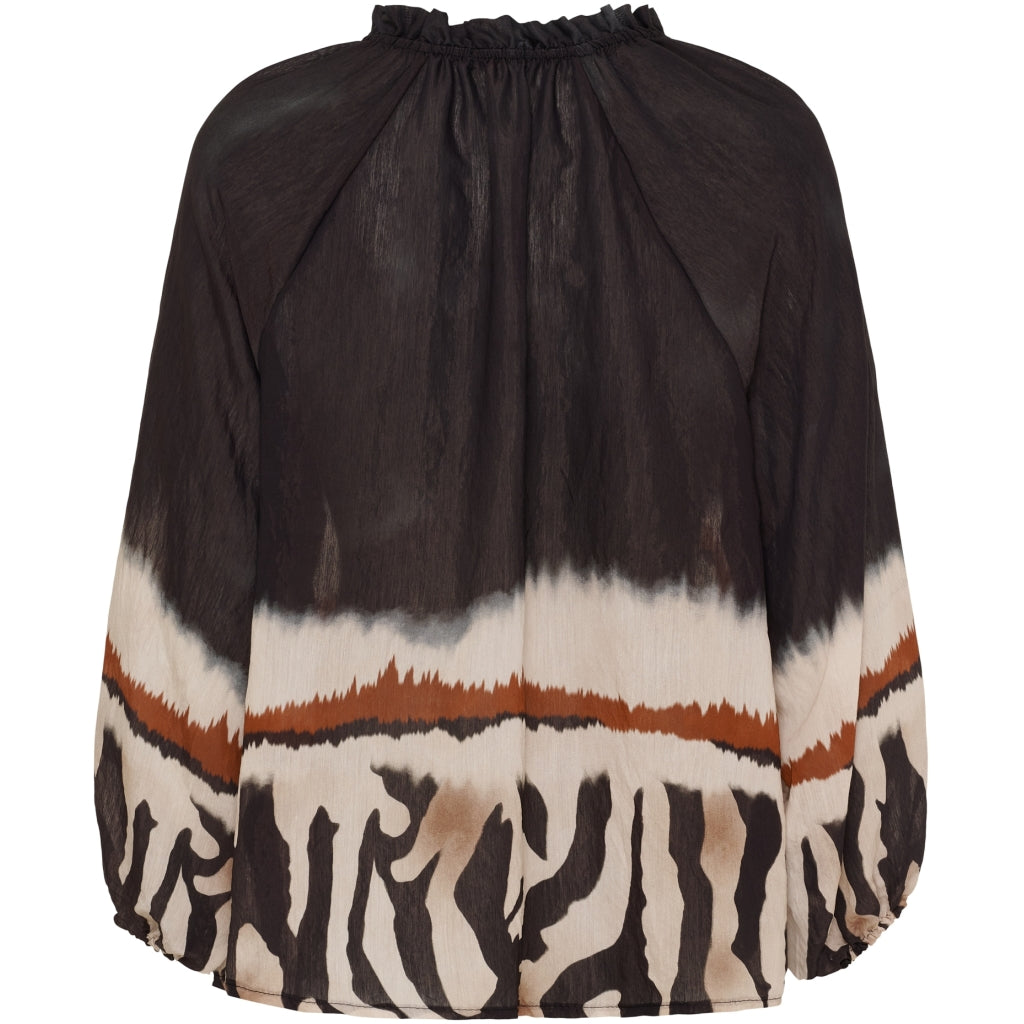 Söt blus från Marta du Château i en snygg tryck. Blusen har en V-ringning med volangdetalj och är lite längre bak än fram. Den kan stylas med både jeans och sneakers för en vardagslook, eller en kjol och ballerina för finare tillfällen.